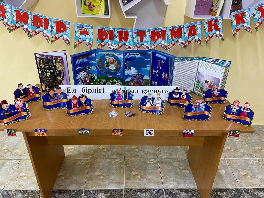 Қазақстанда тұратын барлық ұлттар мен ұлыстар еліміздің ашық аспаны мен көк туының астында бейбіт өмір кешуде. Кең байтақ еліміз Қазақстан алуан ұлтты бауырына басқан, бейбітшілік пен татулықты әлемге үлгі еткен, достық пен ынтымақ елі. 1 мамыр - Бірлік, татулық күніне орай мектеп кітапханашысы М.Джанова "Ел бірлігі- ең асыл қасиет" атты кітап көрмесін ұйымдастырды.