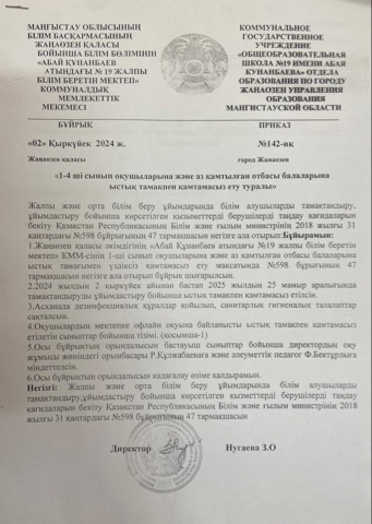 - 1-4 сынып оқушыларын ыстық тамақпен қамтамасыз ету бұйрығы