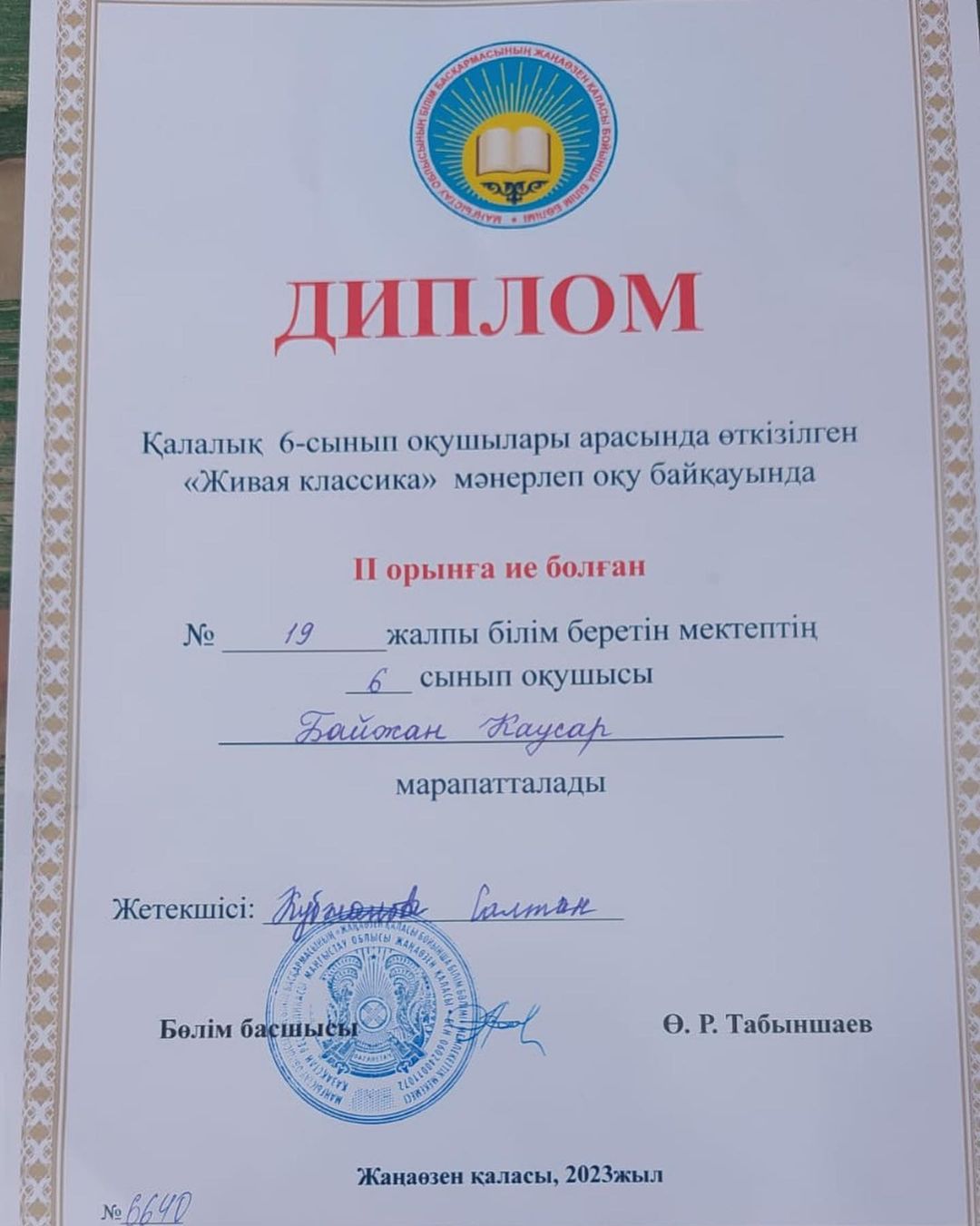 Қалалық 6-сынып оқушылары арасында өткізілген “Живая классика” мәнерлеп оқу байқауында мектебіміздің 6-сынып оқушысы Байжан Каусар 2 орынға ие болды. Жетекшісі: Кубжанова Салтан ҚҰТТЫҚТАЙМЫЗ!